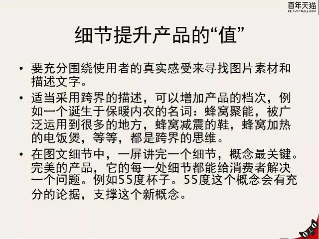《舌尖上的中国》系列,这些菜肴不是开播的时候才有的。 透过表面讲源头!但是当所有人都开始讲故事的时候,消费者就不吃这一套了。讲故事是和同类宝贝拉开距离的关键。所以借鉴文化,带着消费者走进一个新的地域,也就是要讲和别人不一样的故事。当同是做服装的同行都在讲设计理念这么抽象的东西的时候,你不妨讲一讲你的布料,讲一讲你的花色选择,这才能算是是产品溢价的关键。