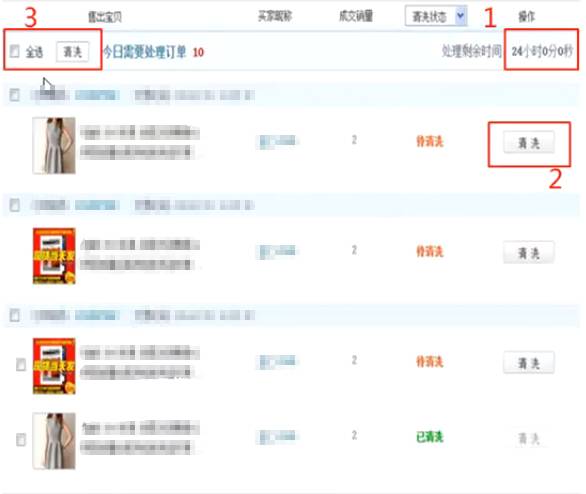 3丶如待清洗订单较多,可以勾选相应订单后点清洗。