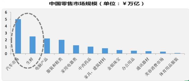 我们再从另外一个角度来看一下零售,我们国家的整个社会零售消费差不多26万亿到27万亿,对比房地产新增每年是9万亿,我们按照品类分一下,看看品类的情况是怎么样的,我们突然发现这张图和上一张图很像,排在前面的两个和这边后面的两个,最大的品类反而是最难电商化的。
